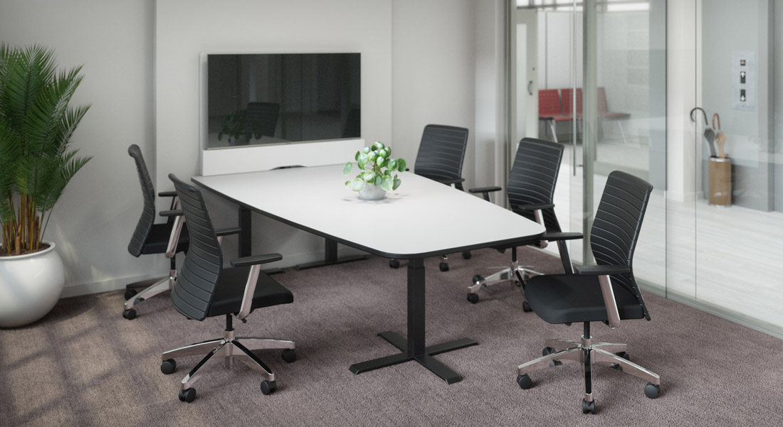 The upCentric video conference tables make remote collaborative working easier and more comfortable. Tapered work surface design gives everyone a full view of the screen. The height adjustable feature allow attendees to easily alternate between seated and standing positions, thus reducing stress and muscle tension, while boosting energy and increasing team productivity. Video Display Mount provides a flexible range of mountable table top sizes, and hides all wires and hardware, directing them under the table to cable management. The upCentric video conference tables are designed to match other upCentric tables and desks, providing a cohesive look and feel throughout the working environment.